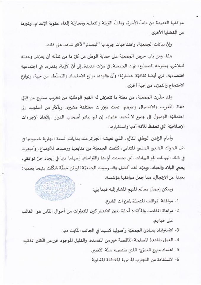 لتعلمَ الأمة أن جمعيّة العلماء المسلمين الجزائريّين، ومنذ أن استأنفت نشاطاتها سنة 1989م، ما فتئت تسعى جاهدة إلى أن يكون لها حضور إيجابيّ على السّاحة الوطنيّة، وقد تعزز هذا الحضور، بتوفيق من الله في العقدين الأخيرين حيث اتّخذت الجمعيّة لنفسها موقع الرّاصد المعايش المتتبّع، والدّارس الواعي المقدّر، والنّاصح الأمين، وفاء منها لشعارها الباديسي “الحقّ فوق كلّ أحد، والوطن قبل كلّ شيء”.