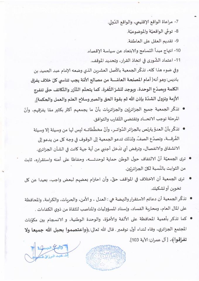 وفي ضوء هذا كله، تذكّر الجمعية بالأصل العشرين الذي وضعه الإمام عبد الحميد بن باديس، وهو أنه  أمام المصلحة العامّ ة من مصالح الأمّة يجب تناسي كلّ خلاف يفرّق الكلمة ويصدّع الوحدة، ويوجد للشرّ الثّغرة، كما يتحتّم التّآزر والتّكاتف حتّى تنفرج الأزمة وتزول الشدّة بإذن الله ثم بقوة الحق والصبر وسلاح العلم والعمل والحكمة .