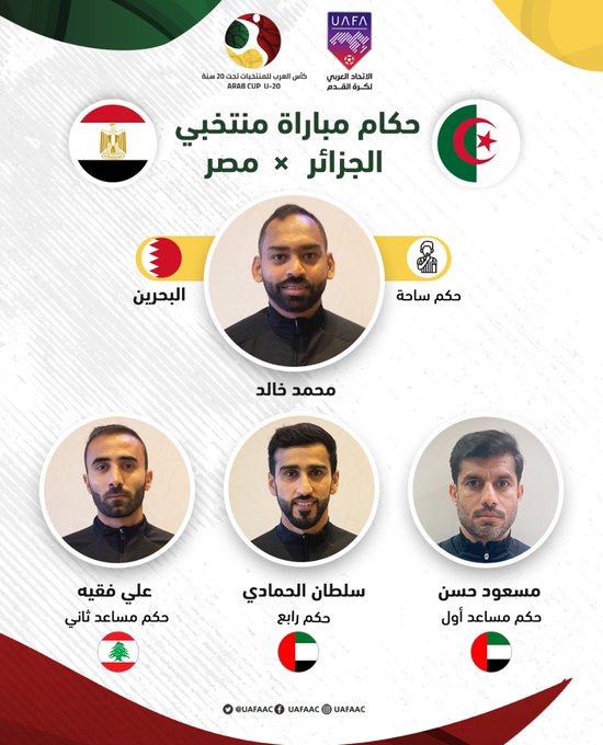 عينت هيئة التحكيم، للاتحاد العربي لكرة القدم، الحكم البحريني محمد خالد، لإدارة نصف نهائي كأس العرب بين الجزائر، ومصر.
