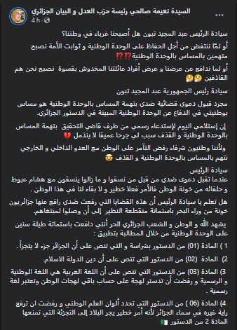 كما وجهت نعيمة صالحي في آخر منشور لها رسالة إلى رئيس الجمهورية، عبد المجيد تبون، حول التهمة المنسوبة إليها. والمتعلقة بالمساس بالوحدة الوطنية.