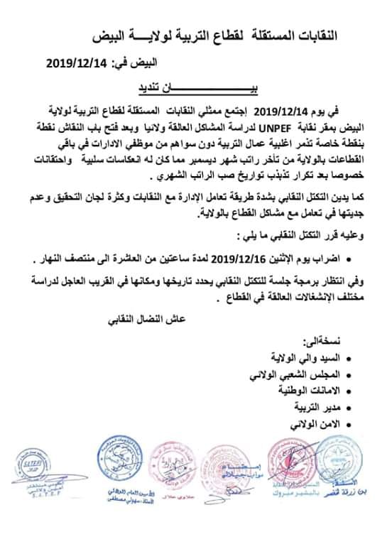 أعلنت النقابات المستقلة لقطاع التربية بولاية البيض عن الدخول في إضراب الاثنين المقبل من العاشرة صباحا إلى منتصف النهار.