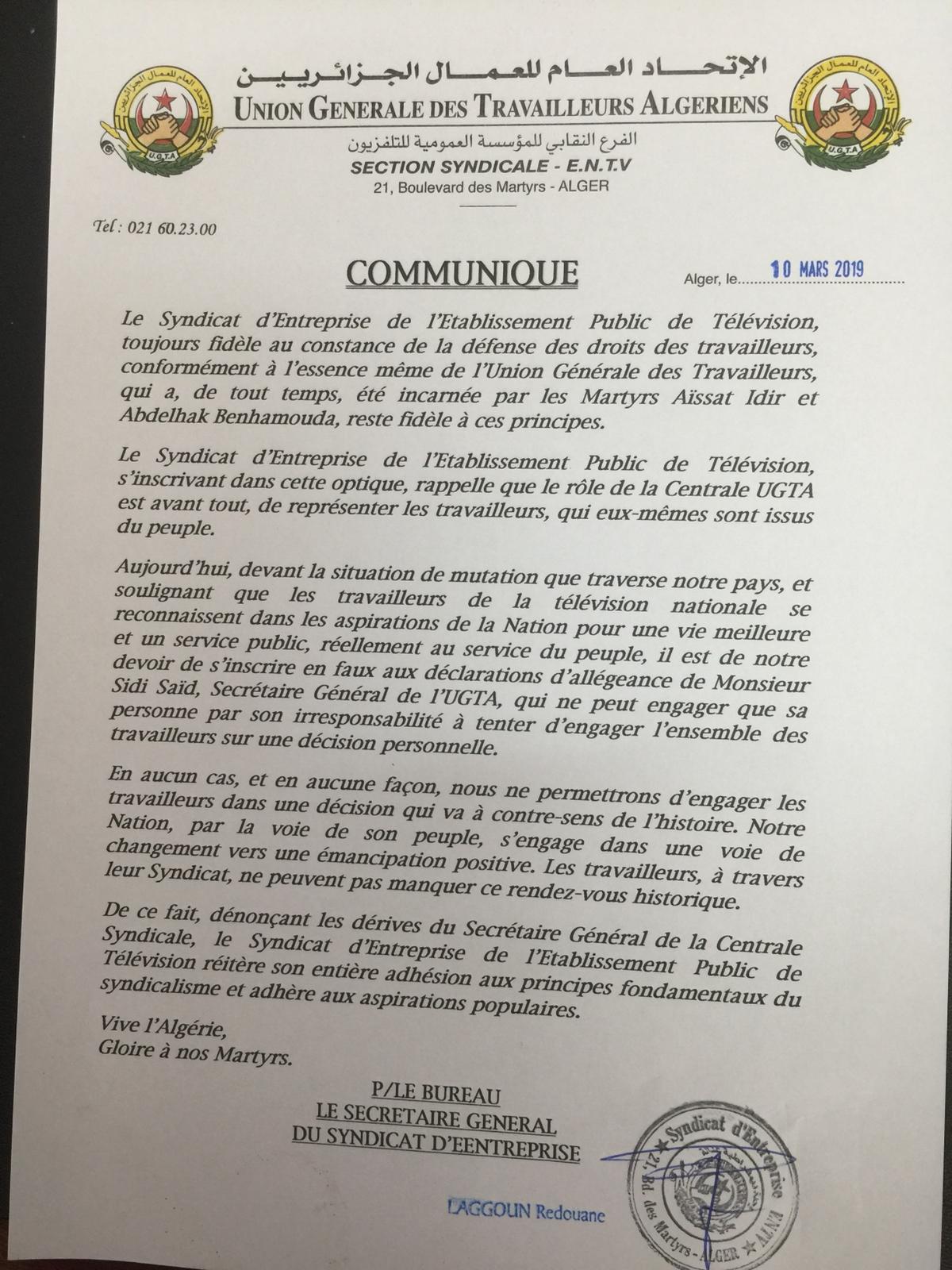 وحاليا وبالنظر للوضعية التي تعيشها الجزائر، يؤكد الفرع النقابي لمؤسسة التلفزيون العمومي، بأن ممثلو العمال يناضلون لأجل حياة أفضل.