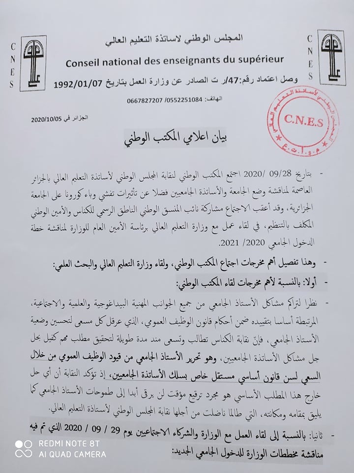 جاء ذلك خلال اجتماع للمكتب الوطني لنقابة المجلس الوطني لأساتذة التعليم العالي بالجزائر العاصمة لمناقشة وضع الجامعة والأساتذة الجامعيين فضلا عن تأثيرات تفشي وباء كورونا على الجامعة الجزائرية.