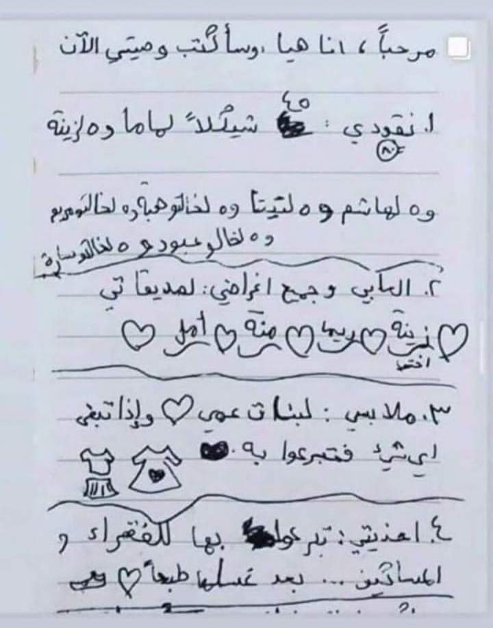 وجاء في وصية “هيا”: “مرحبا، أنا هيا، سأكتب وصيتي الآن”. “نقود 45 شيكلا لماما و5 لزينة و5 لهاشم و5 لتينا و5 لخالتو هبة و5 لخالتو مريم”. “و5 لخالو عبود و5 لخالتو سارة”.