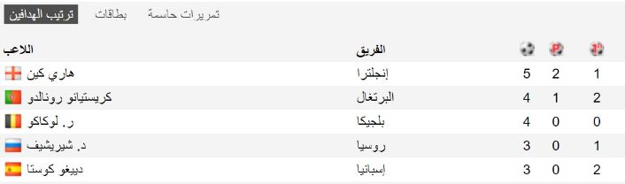 ويحتل مهاجم نادي توتنهام الإنجليزي ومنتخب الأسود الثلاثة، هاري كين، صدارة الهدافين في هذا الدور، بمجموع خمسة أهداف.