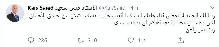 وقال قيس سعيد في منشور له عبر صفحته الرسمية على “فايسبوك”، إن يشكر من أعماق قلبه كل من دعمه ومنحه ثقته.