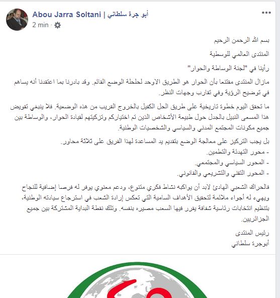 ونشر سلطاني على صفحته الرسمية في فايسبوك:”مازال المنتدى مقتنعا بأن الحوار هو الطريق الاوحد لحلحلة الوضع القائم. وقد بادرنا بما اعتقدنا أنه يساهم في توضيح الرؤية وفي تقارب وجهات النظر.