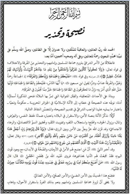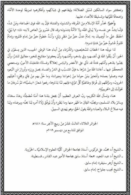 وحذر البيان الذي وقعه الشيخ فركوس، والدكتور عبد المجيد جمعة والشيخ أزهر سنيقرة والشيخ نجيب جلواح، الجزائريين من الفرقة والفتنة والشذوذ.