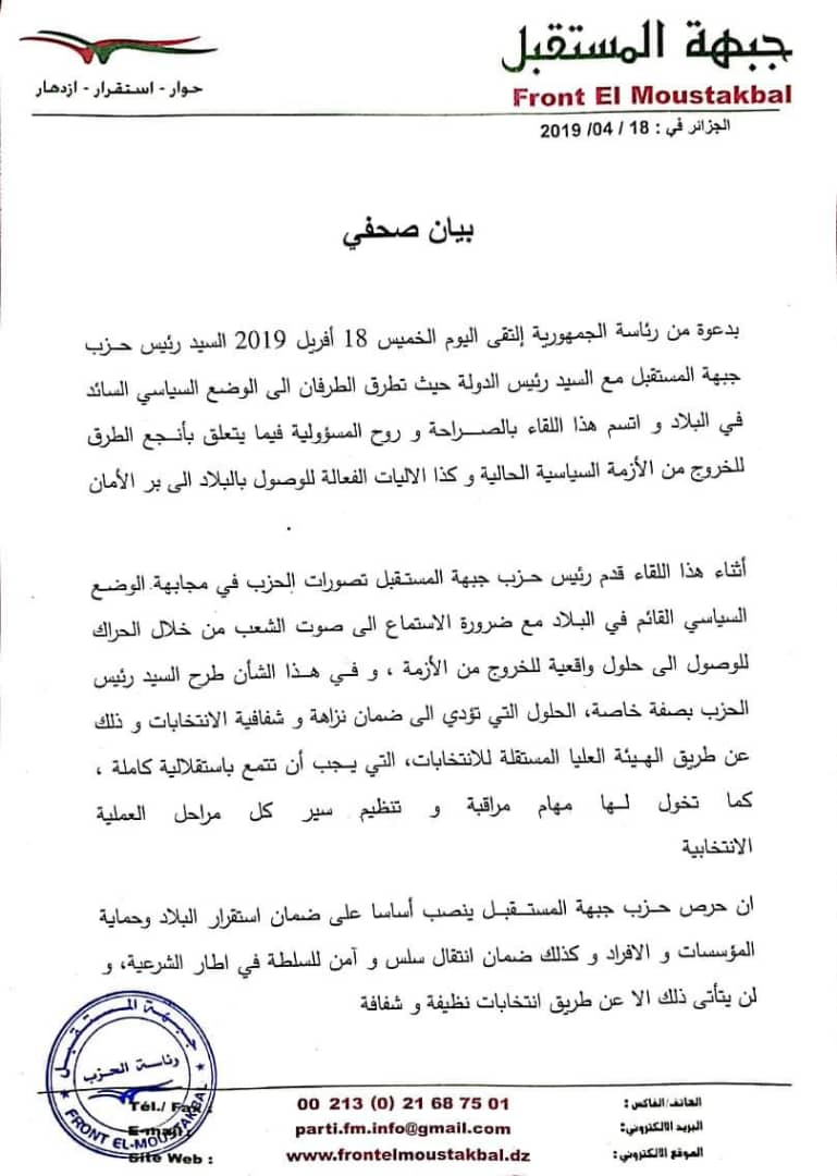 وحسب بيان لحزب جبهة المستقبل فإن الاستقبال وقد جرى بمقر رئاسة الجمهورية.