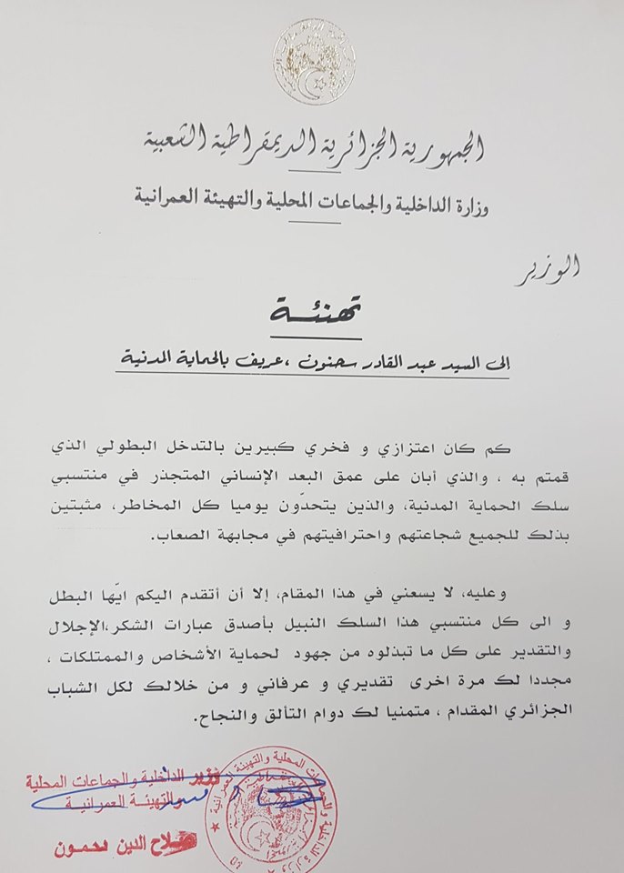 هنأ وزير الداخلية صلاح الدين دحمون عون الحماية المدنية، عبد القادر سحنون الذي تدخل أمس في حريق وهران وانقذ عائلة من الموت.