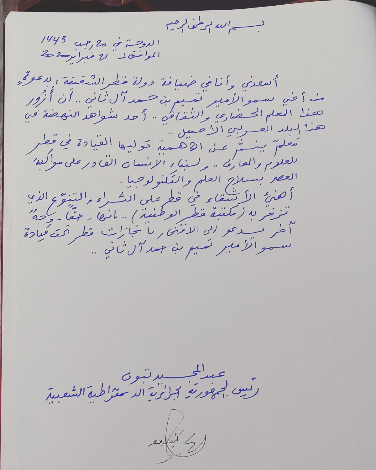 قام رئيس الجمهورية، عبد المجيد تبون، بزيارة المكتبة الوطنية لقطر، حيث تلقى شروحات حول المخطوطات والمؤلفات التي تحتويها. كما كتب الرئيس كلمة على سجل الموجود في المكتبة. وبدأ الرئيس تبون كلمته بـ”بسم الله الرحمن الرحيم”، الدوحة 20 رجب 1443 ه الموافق لـ21 فبراير 2022″.