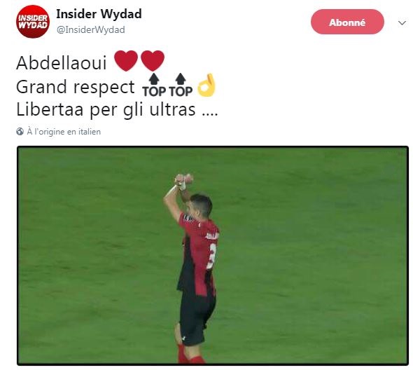 ونشرت صفحة الوداد البيضاوي على تويتر رسالة شكر لمدافع فريق سوسطارة على تضامنه مع ألتراس المغرب.