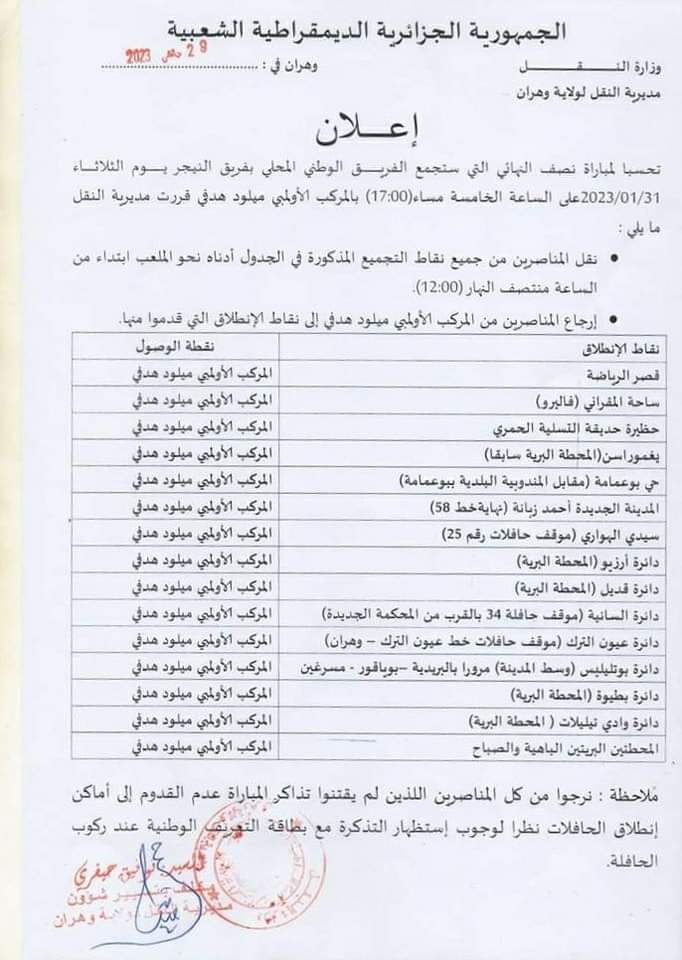 كشفت مديرية النقل لولاية وهران اليوم الأحد عن مُخطط نقل المُناصرين لملعب ميلود هدفي تحسبا لمواجهة المُنتخب الوطني للاعبين المحليين أمام النيجر.