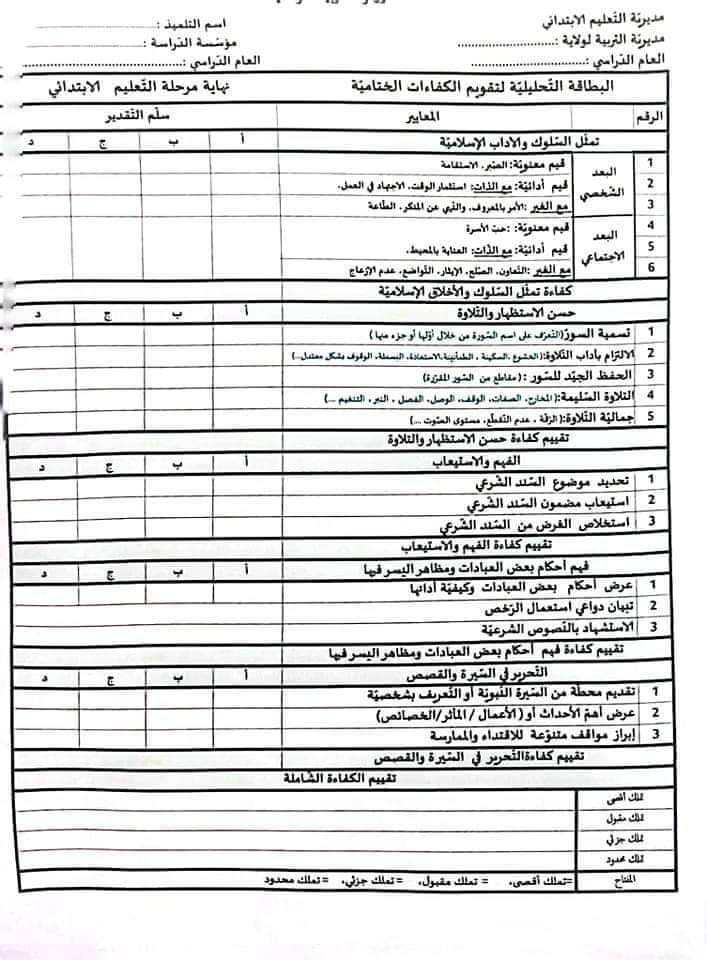 هذا هو نموذج تقييم مكتسبات التلميذ في مادة التربية الإسلامية