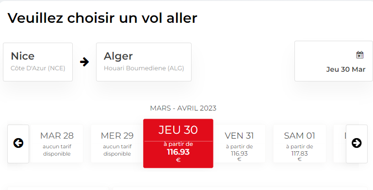 ووفقا لموقع Air Algérie، تتوفر رحلات ذات اتجاه واحد على خط نيس - الجزائر بسعر يبدأ من 116 أورو خلال شهر مارس وفي بداية أفريل.