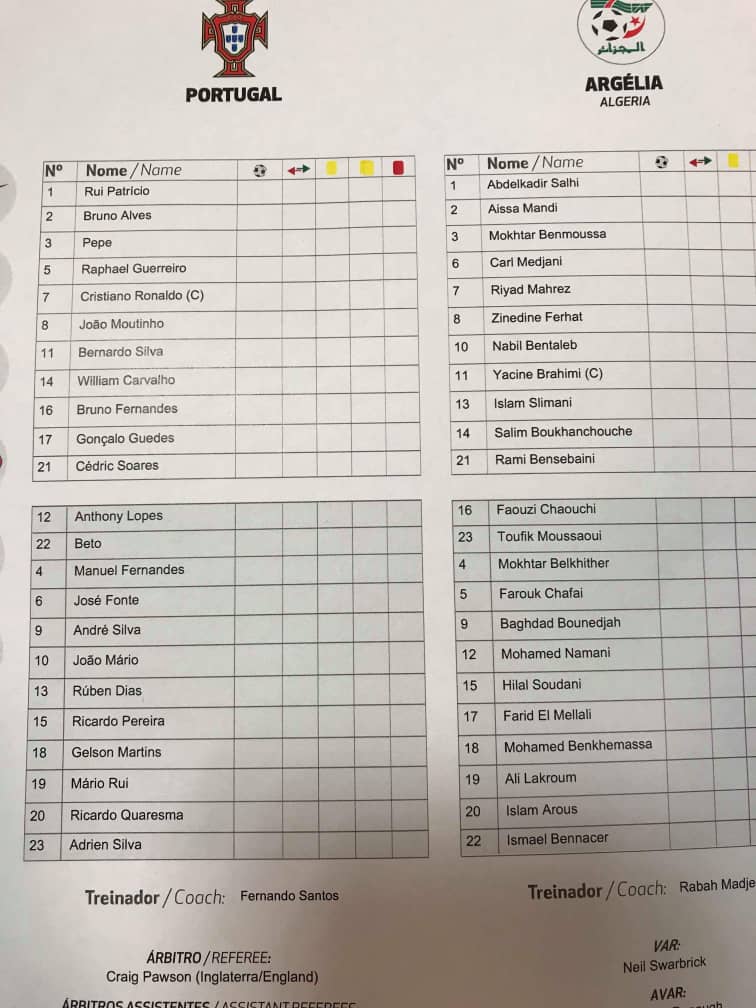 اجرى الناخب الوطني رابح ماجر بعض التغييرات على التشكيلة الأساسية التي ستواجه البرتغال بعد قليل وديا، بينما شهدت تشكيلة البرتغال تواجد النجم رونالدو اساسيا.