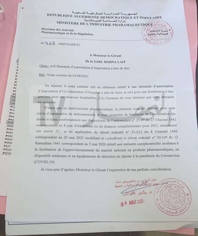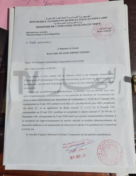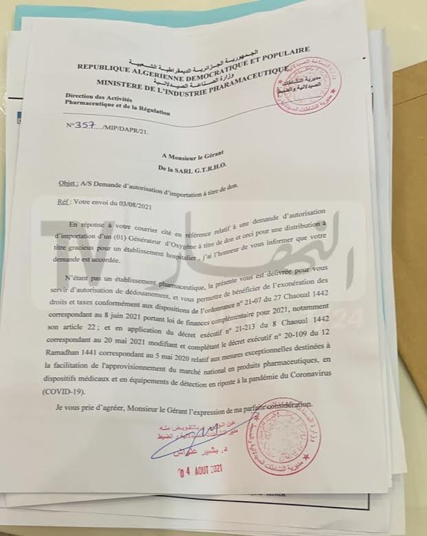 تحصلت 4 مؤسسات رسميا على ترخيص من طرف وزارة الصناعة الصيدلانية من أجل إستيراد مولدات الأوكسيجين.