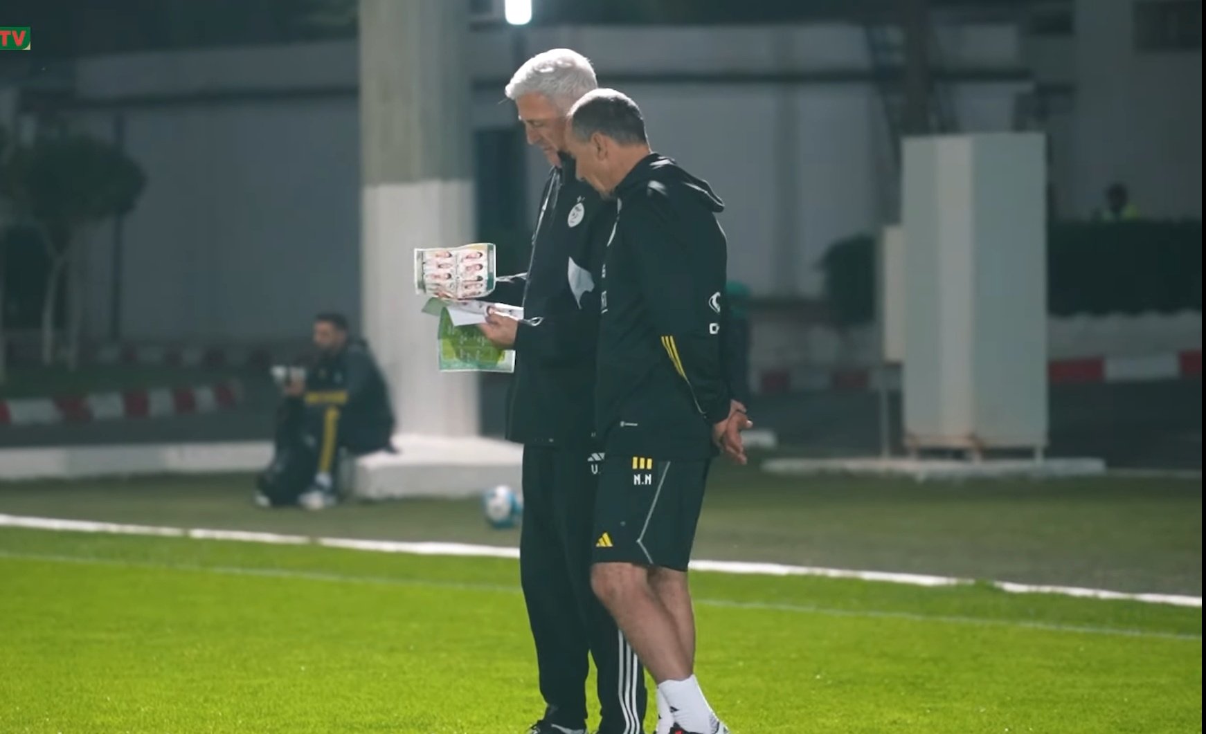 وأظهرت صورة مسربة من مركز سيدي موسى، مدرب الخضر بيتكوفيتش، وهو يقف بجانب مساعده نبيل نغيز، حاملا ورقة تضم صور للعناصر الوطنية.