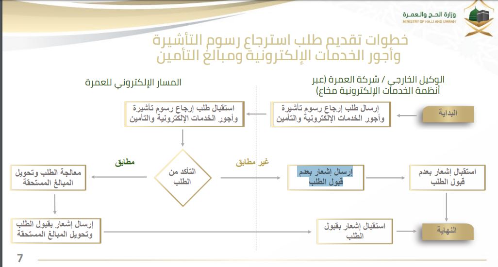 أما في حال عدم مطابقة طلب استرجاع رسوم تأشيرة العمرة، يتم إرسال إشعار بعدم قبول الطلب.