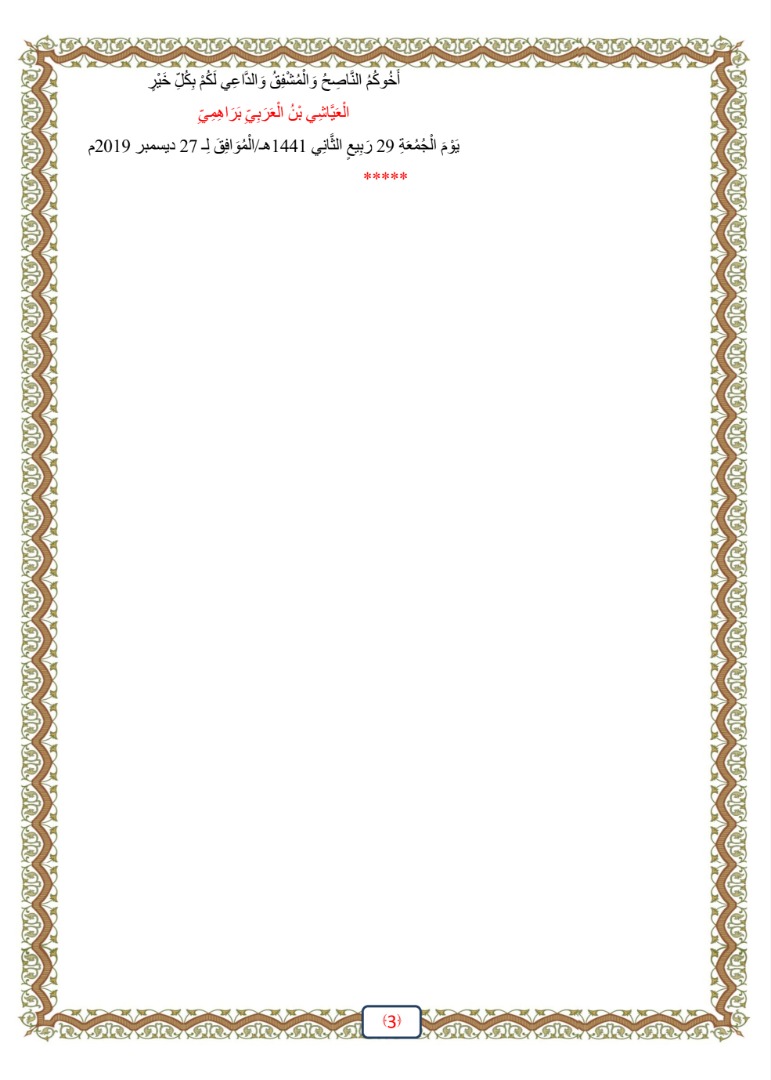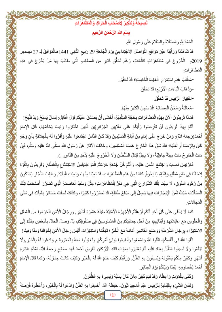 وجه الداعية العياشي بن العربي براهمي رسالة للحراك الشعبي عنونها بـ”نصيحة وَتَذْكِيرٌ لِأَصْحَابِ الْحَرَاكِ وَالْمُظَاهَرَاتِ”.