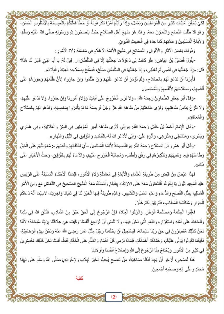 فَلْنَتَعَاوَنْ مَعَهُ عَلَى الِارْتِقَاءِ بِبَلَدِنَا, وَلْنَسْلُكْ مَعَهُ الْمَنْهَجَ الصَّحِيحَ فِي التَّعَامُلِ مَعَ وَلِيِّ الْأَمْرِ الْمُسْلِمِ؛ بِبَذْلِ النُّصْحِ وَالدُّعَاءِ وَعَدَمِ السَّبِّ وَالتَّشْهِيرِ، وَهَذِهِ طَرِيقَةٌ فِيهَا الْخَيْرُ لَنَا فِي دُنْيَانَا وَآخِرَتِنَا، لَاسِيَّمَا أَنَّهُ دَعَاكُمْ لِلْحِوَارِ وَمُنَاقَشَةِ الْمَطَالِبِ، فَلَمْ يَبْقَ لَكُمْ عُذْرٌ.