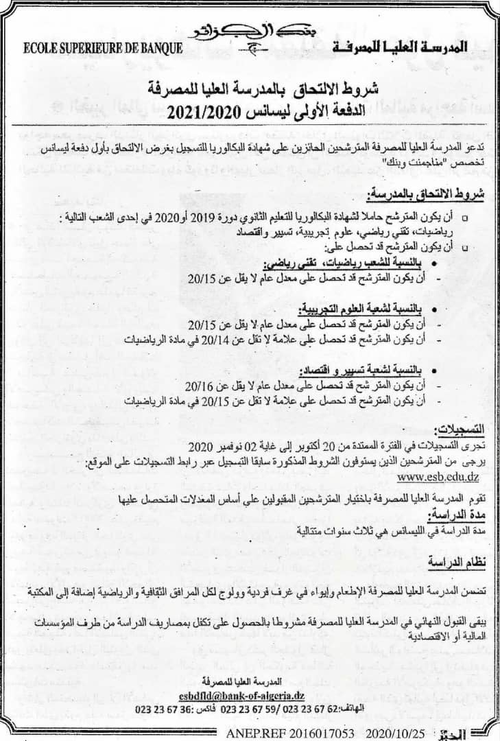 تم تحديد شروط الإلتحاق بالمدرسة العليا للمصرفة بخصوص الدفعة الأولى ليسانس للموسم الدراسي 2020-2021.