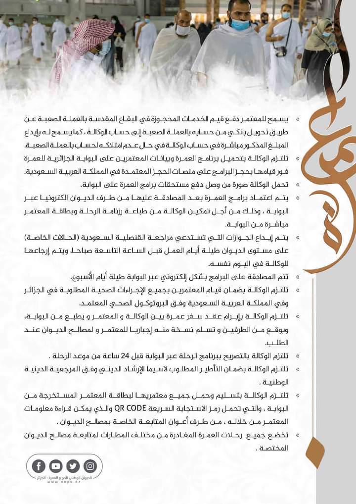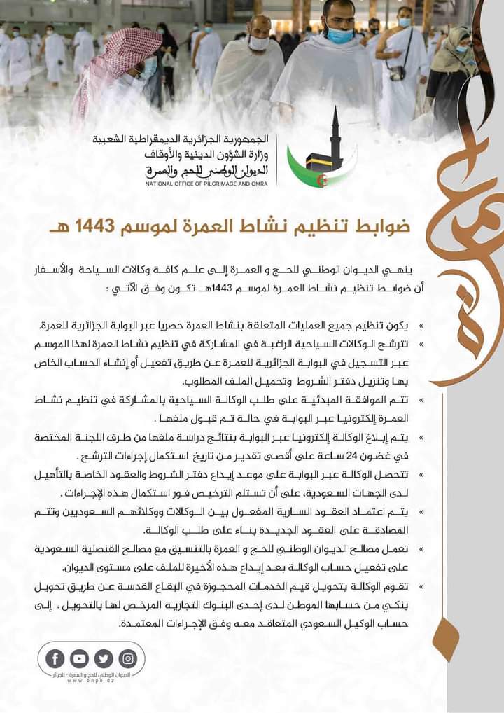 كما كشف المدير العام للديوان الوطني للحج و العمرة، أحمد سليماني، أن التلقيح ضد فيروس كورونا (كوفيد-19)، شرط إلزامي بالنسبة للأشخاص الراغبين في أداء شعيرة العمرة. وكالات السياحة والأسفار مطالبة باحترام وتطبيق هذا الشرط لضمان حسن سير العملية.