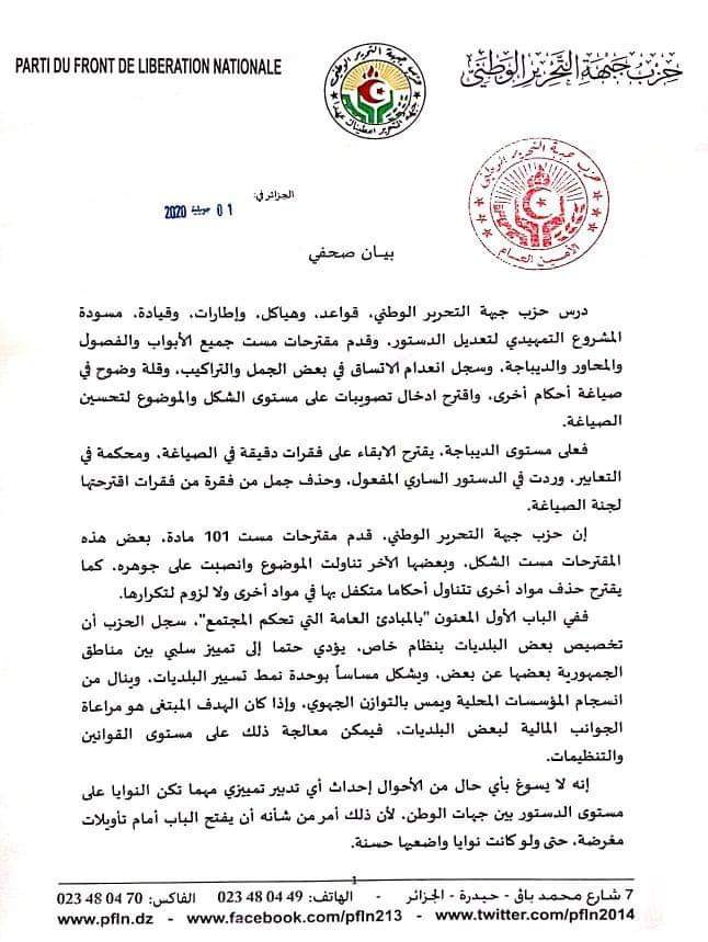 قدم حزب جبهة التحرير الوطني مقترحات مست 101 مادة بخصوص مسودة المشروع التمهيدي لتعديل الدستور.