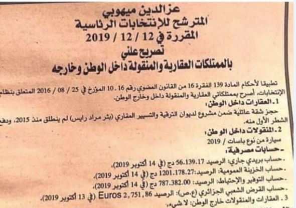 صرح المترشح عن حزب “الأرندي” عز الدين ميهوبي بممتلكاته تمهيدا لدخوله سباق رئاسيات 12 ديسمبر المقبل.