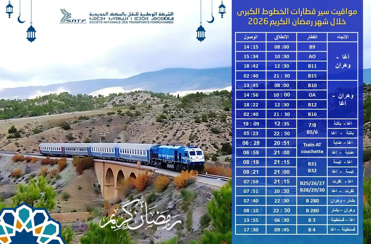 أعلنت الشركة الوطنية للسكك الحديدية، اليوم الثلاثاء، عن مواقيت سير قطارات الخطوط الكبرى خلال شهر رمضان الكريم 2026 .
