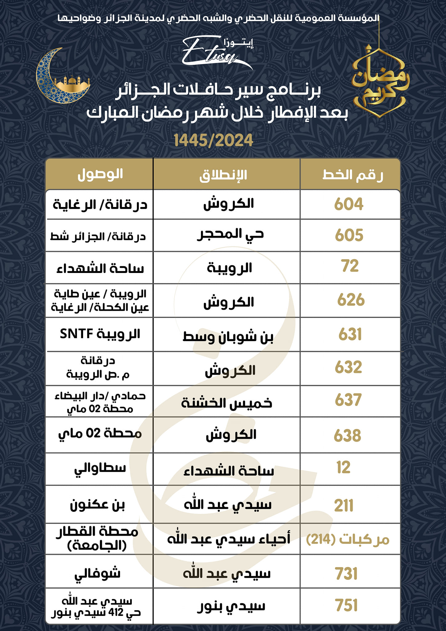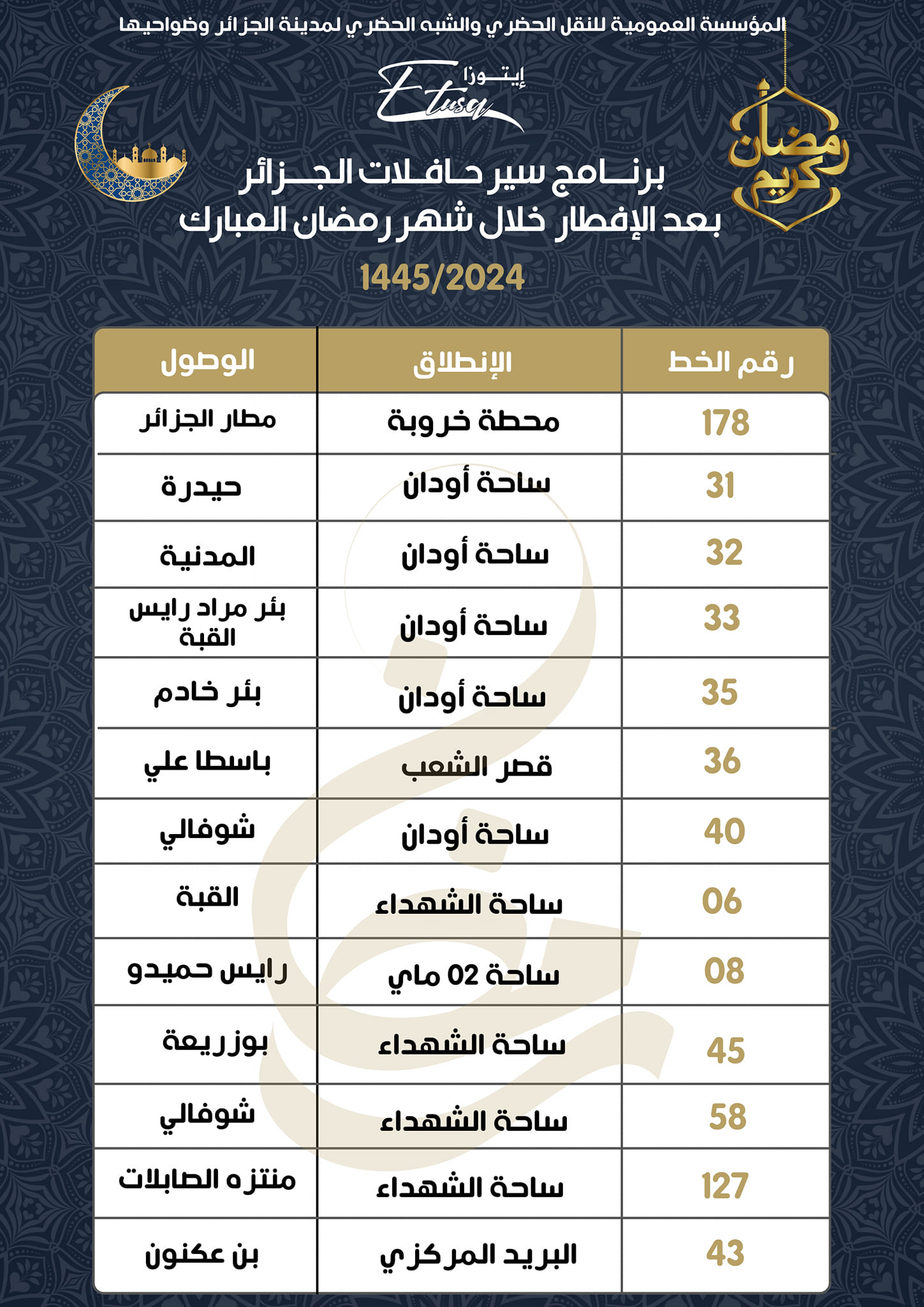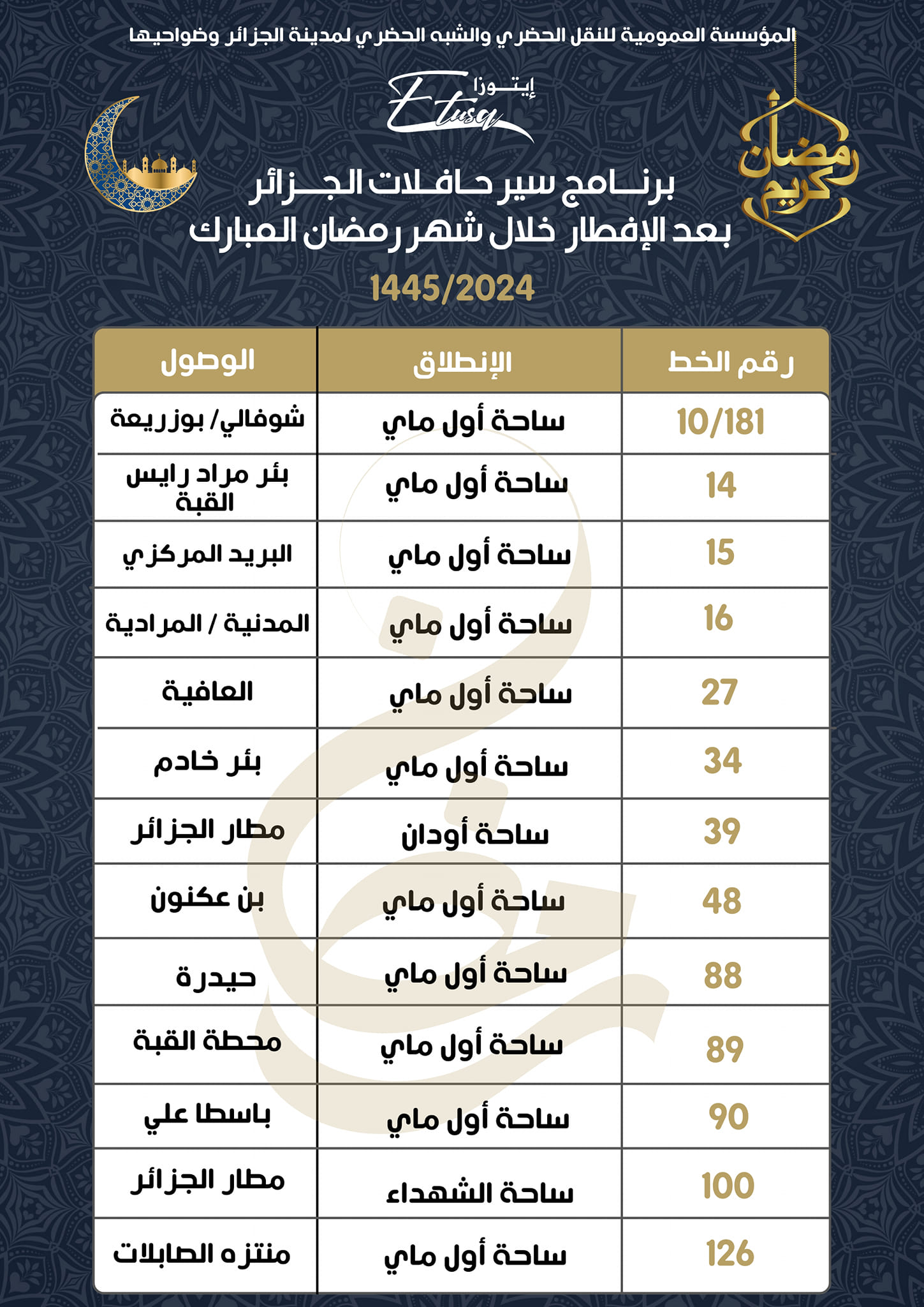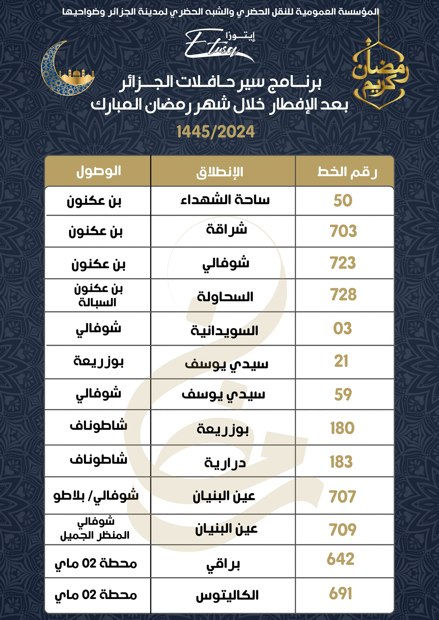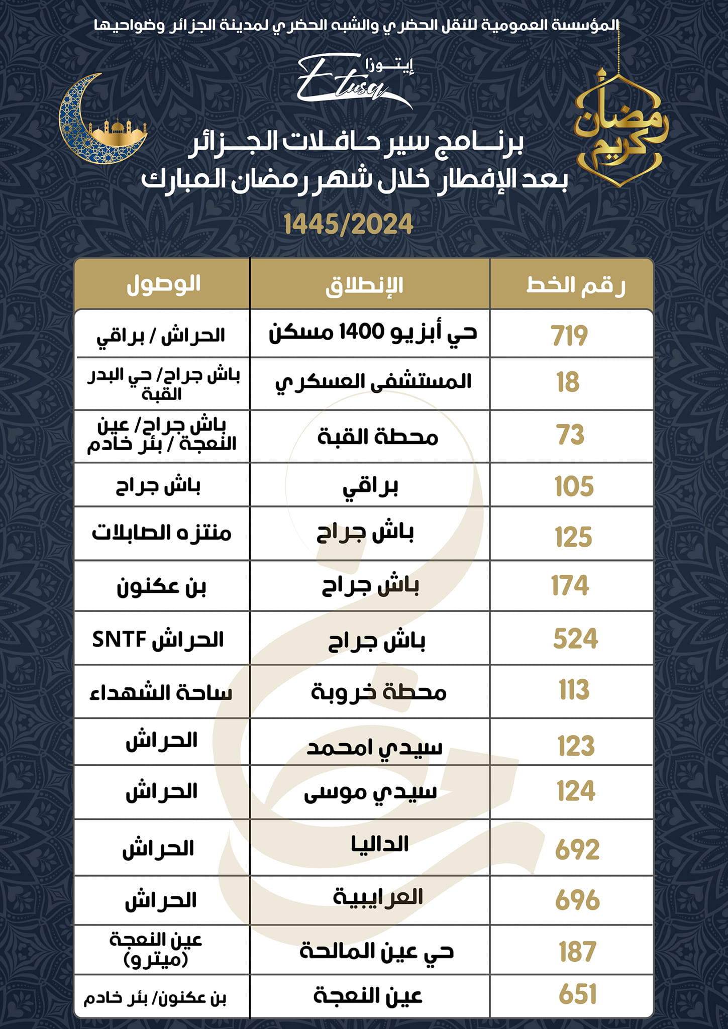 كشفت المؤسسة العمومية للنقل الحضري والشبه الحضري لمدينة الجزائر وضواحيها، اليوم الإثنين، عن مواقيت وبرنامج عمل حافلات الجزائر بعد الإفطار خلال شهر رمضان المبارك 1445/2024.