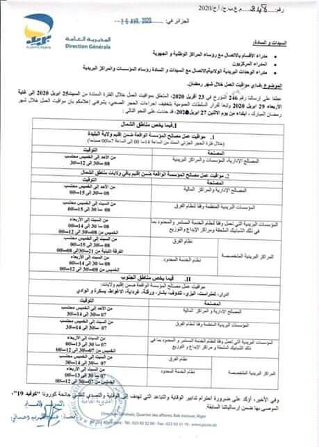 وقد عملت المديرية العامة على تقسيم مواقيت العمل حسب ثلاث مناطق من الوطن تبعا لاجراءات الحجر الصحي.