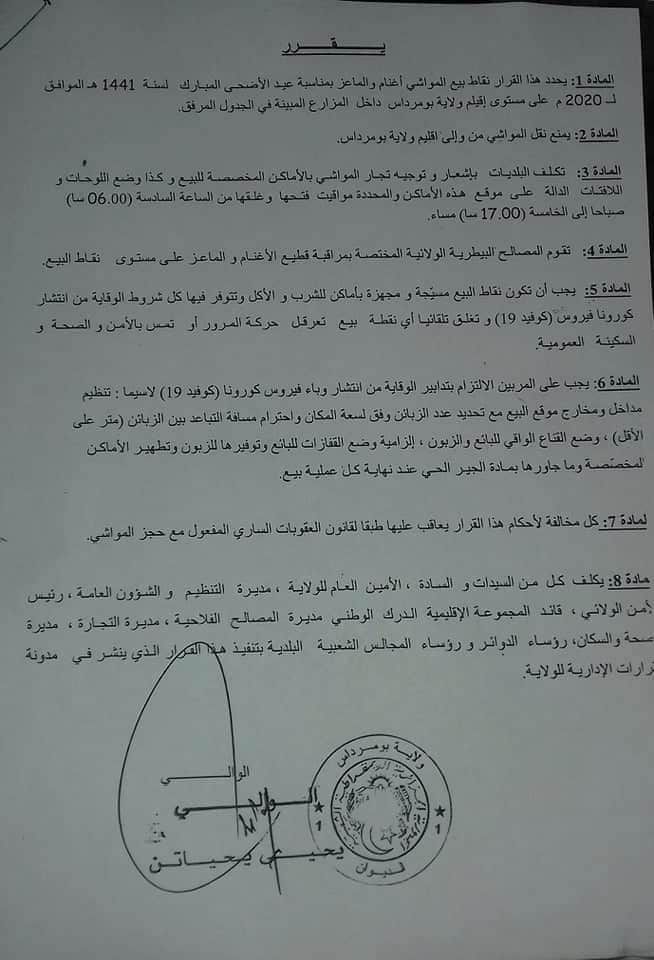 وأشار البيان، إلى أنه يمنع نقل المواشي من داخل وخارج اقليم ولاية بومرداس.