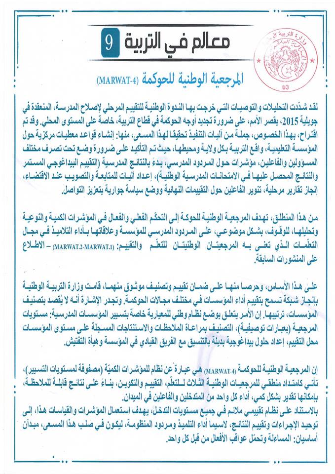 حيث قامت وزارة التربية على ضمان تقييم وتصنيف موثوق، بإنجاز شبكة تسمح بتقييم أداء المؤسسات في مختلف مجالات الحوكمة.