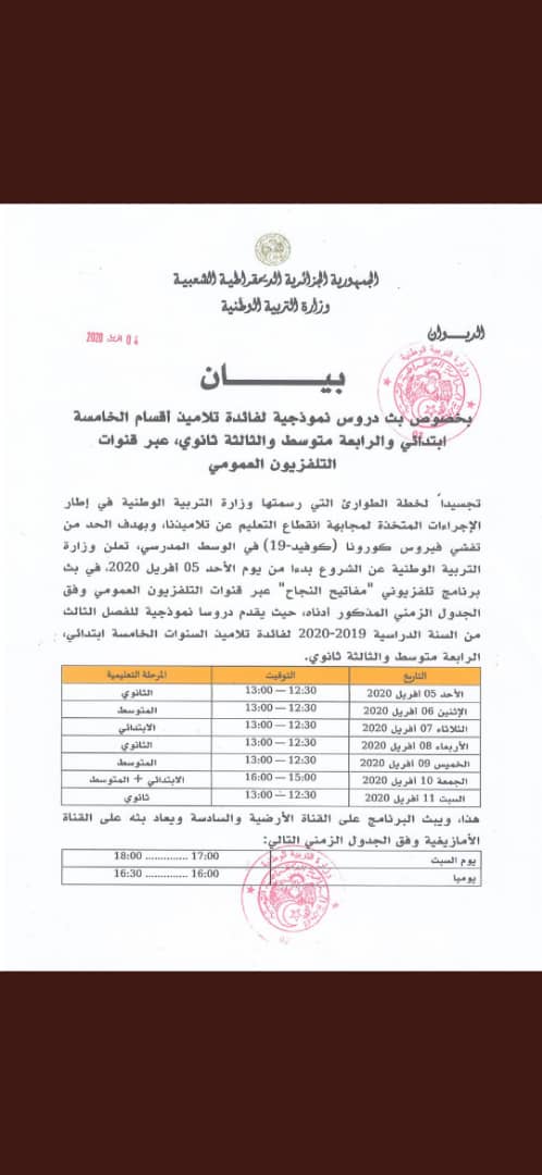 وأشار نفس البيان، إلى أنه سيتم الشروع في بث الدروس بداية من يوم غد الأحد في برنامج تلفزيوني ” مفاتيح النجاح”.