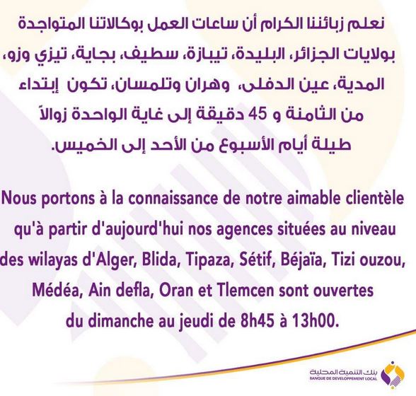 نشرت المديرية العامة لبنك “BDL”، اليوم الأحد، مواقيت عمل وكالاتها المتواجدة عبر الولايات التي فرض عليها الحجر الجزئي، بسبب انتشار فيروس كورونا.