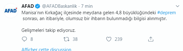 أعلن مركز الزلازل التركي، اليوم الثلاثاء، عن تسجيل هزة أرضية بشدة 4.8 درجات على سلم ريشتر بولاية “مانيسا” غرب تركيا.