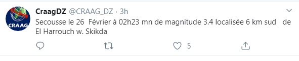 وحدد مركز البحث في علم الفلك والفزياء الفلكية والجيوفيزياء مركز الهزة الأرضية بـ 6 كلم جنوب الحروش بولاية سكيكدة.