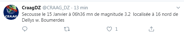 أما الهزة الثانية ضربت في حدود الساعة السادسة و 36 دقيقة، بلغت شدتها 3.2 درجة على سلم ريشتر، وسجلت على بعد 16 كلم شمال منطقة دلس بولاية بومرداس.