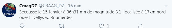 وذكر المركز أن الهزة الأولى ضربت في حدود الساعة السادسة و 31 دقيقة، بلغت شدتها 3.1 درجة على سلم ريشتر، سجلت على بعد 17  كلم شمال غرب منطقة دلس بولاية بومرداس.
