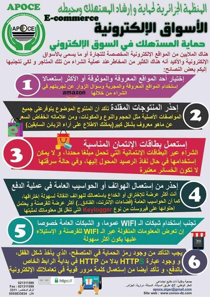 حدّدت المنظمة الجزائرية لحماية وإرشاد المستهلك، 6 شروط ونصائح لرواد الأسواق الإلكترونية، بهدف تفادي المخاطر المحتملة عند عملية الشراء.