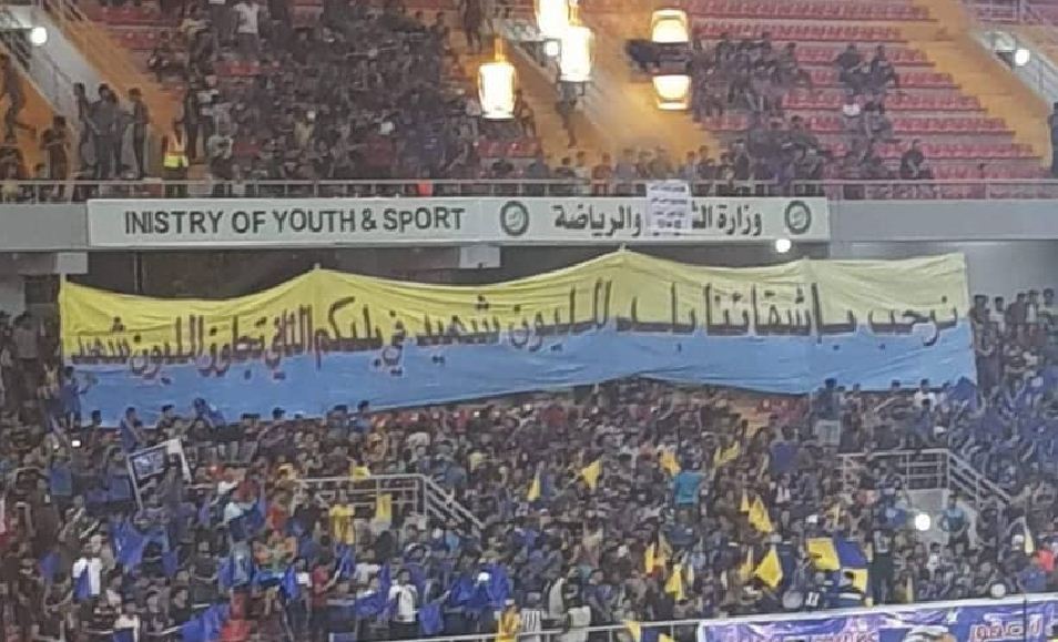 ورفع جمهور “الجوية لافتة كبيرة بملعب كربلاء، كتب عليها:”نرحب بأشقائنا بلد المليون شهيد في بلدكم الثاني، تجاوز المليون الشهيد”.