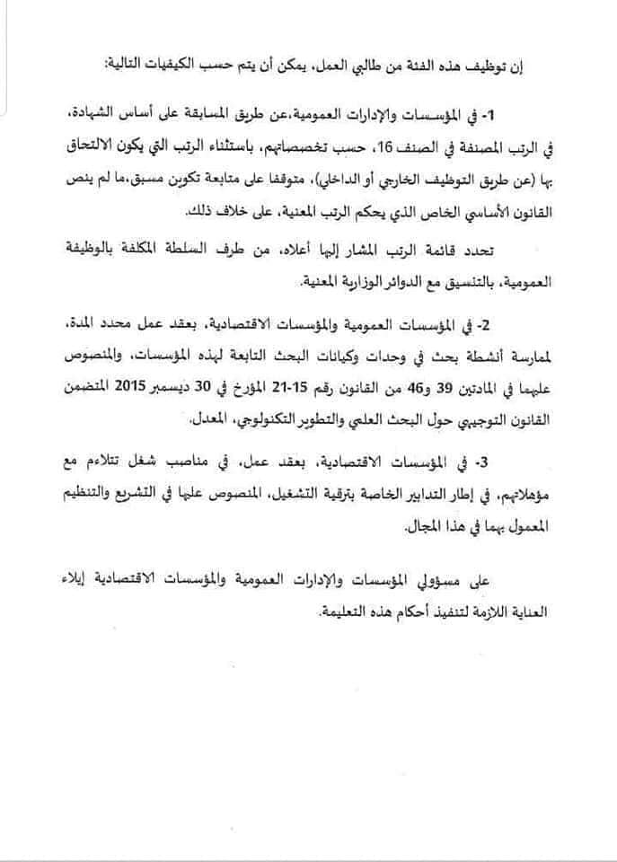 وجاءت التعليمة الوزارية التي تحوز “النهار” على نسخة منها، من أجل تعزيز تشغيل الحاصلين على شهادة “الدكتوراه” أو ما يعادلها من الشهادات وفق تدابير محددة، من أجل إدماجهم في الوظيفة العمومية أو حتى في المؤسسات الاقتصادية، كما حملت التعليمة فحوى الاتفاقية الثلاثية، والذي يهدف بالإضافة إلى توظيف حملة شهادة “الدكتوراه”، كما أن تدعيم المؤسسات والإدارات العمومية وكذا المؤسسات الاقتصادية بكفاءات ومؤهلات ستسمح للمؤسسات المذكورة سلفا بمستوى تأطيرها، كما حددت التعليمة الوزارية المشتركة، كيفية توظيف حاملي شهادة “الدكتوراه” أو ما يعادلها، يتم بكيفيات ثلاث، أولها أن توظيفهم يتم عن طريق المسابقة على أساس الشهادة ضمن الصنف 16 حسبب تخصصهم، ويستثنى أصحاب الرتب الذين سبق التحاقهم عن طريق التوظيف الداخلي أو الخارجي، ومتوقفا على متابعة تكوين مسبق، وهذا في حال ما لم ينص القانون الأساسي الخاص الذي يحكم الرتب المعنية على خلاف ذلك، وبالنسبة للمؤسسات العمومية والمؤسسات الاقتصادية، بعقد عمل محدد المدة، وهذا لممارسة أنشطة بحث في وحدات وكيانات البحث التابعة للمؤسسات، والمنصوص عليها في المادتين 39 و46 من القانون 15 ـ 21 المؤرخ في 30 ديسمبر 2015 المتضمن القانون التوجيهي حول البحث العلمي والتطوير التكنولوجي، أما بالنسبة للمؤسسات الاقتصادية، فعقد العمل وضرورة تلاؤم العمل مع المؤهل العلمي  وهذا في إطار التدابير الخاصة بترقية الشغل المنصوص عليها في التشريع والتنظيم المعمول بهما في هذا المجال.