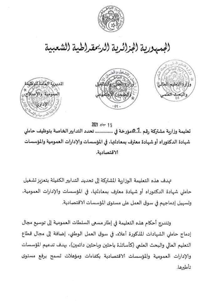 وقّعت كل من وزارة التعليم العالي والبحث العلمي، ووزارة العمل والتشغيل والضمان الاجتماعي، والمديرية العامة للوظيفة العمومية، على تعليمة مشتركة تحدد التدابير الخاصة بتوظيف حاملي شهادة “الدكتوراه” أو شهادة معترف بمعادلها، في المؤسسات والإدارات العمومية والمؤسسات الاقتصادية.