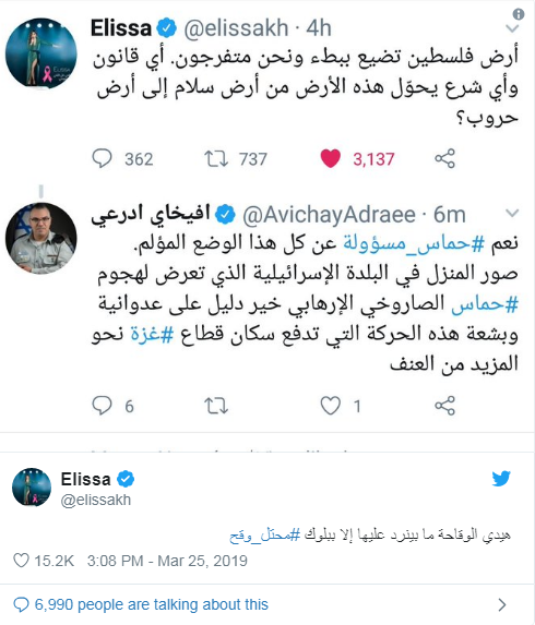 ردت النجمة اللبنانية إليسا بصرامة عبر “تويتر”، على أفيخاي أدرعي المتحدث باسم الكيان الصهيوني.
