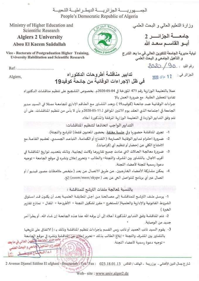 حددت جامعة الجزائر 2، تدابير خاصة للمقبلين على مناقشة أطروحة الدكتوراه، في ظل الاجراءات الوقائية من جائحة كوورنا.