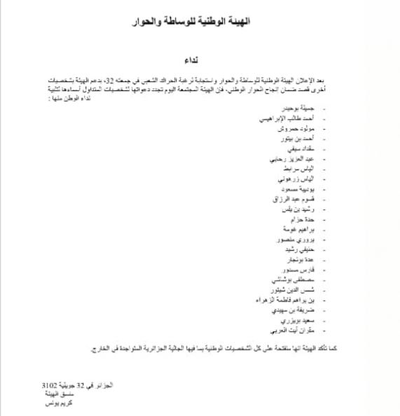 دعت الهيئة الوطنية للوساطة والحوار الوطني، 23 شخصية، من بينها طالب الإبراهيمي وحمروش وبن بيتور، للانضمام إلى صفوفها.