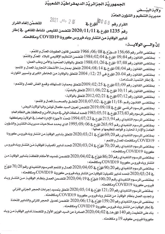 والغى الوالي أحكام القرار رقم 1235 المؤرخ في 11112020 والمتضمن تقليص نشاط المقاهي في إطار تدابير الوقاية من انتشار كورونا.