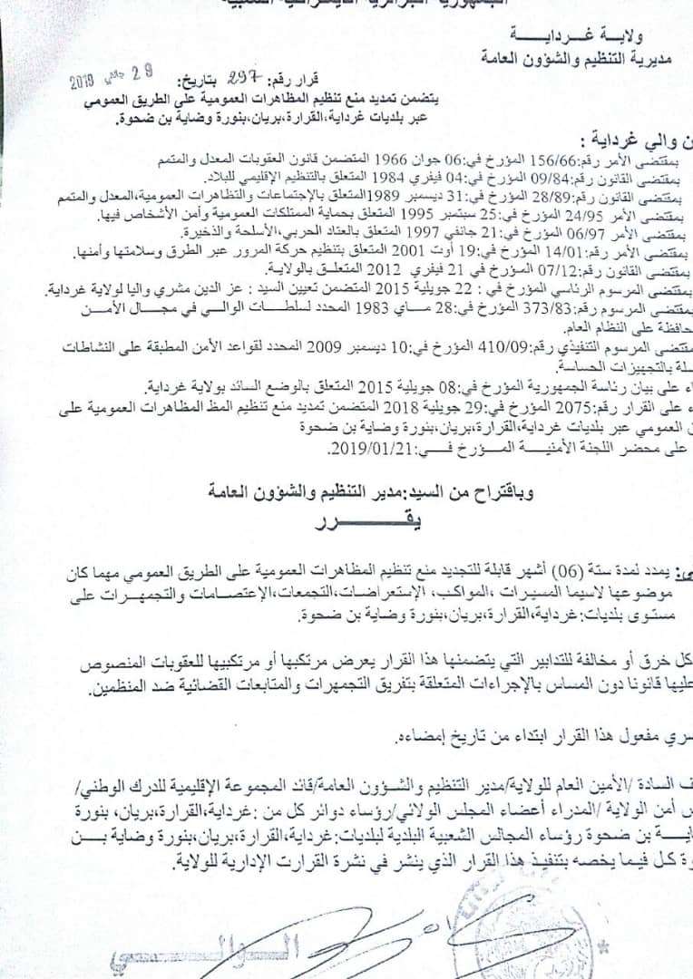 والي غردايةمدد والي غرداية عزالدين مشري تمديد منع تنظيم المظاهرات العمومية على الطريق العمومي مهما كان موضوعها لمدة6 أشهرقابلة للتجديد .
