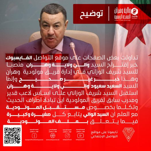 وأضاف البيان، أن والي وهران، سعيد سعيود استقبل شريف الوزاني، على أساس أنه لاعب قدير ومدرب سابق لمولودية وهران.